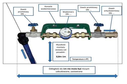 Jeżeli przyłącze wodociągowe jest wyposażone w wodomierz zainstalowany niezgodnie z obowiązującymi warunkami technicznymi należy je DOSTOSOWAĆ na koszt odbiorcy usług.